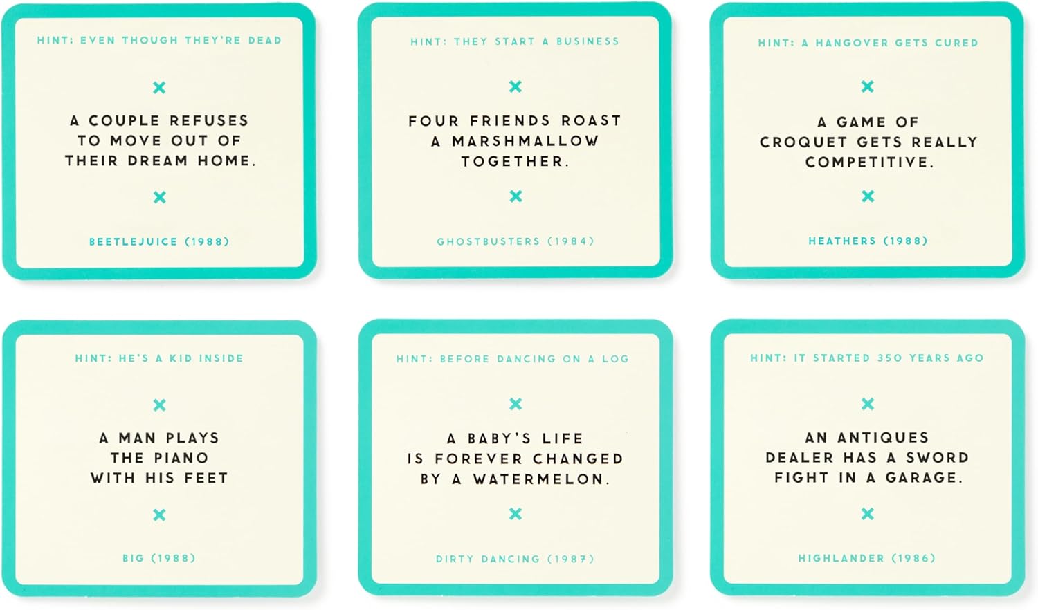 - HOW TO PLAY: Compete with your friends to identify popular 80s movies from the most convoluted movie summaries possible. Has your mom ever tried to explain a film that she just watched? Did it make one ounce of sense? Of course not–and that’s precisely the inspiration for this game. For example: A baby's life is forever changed by a watermelon. Psst, it’s 'Dirty Dancing’.