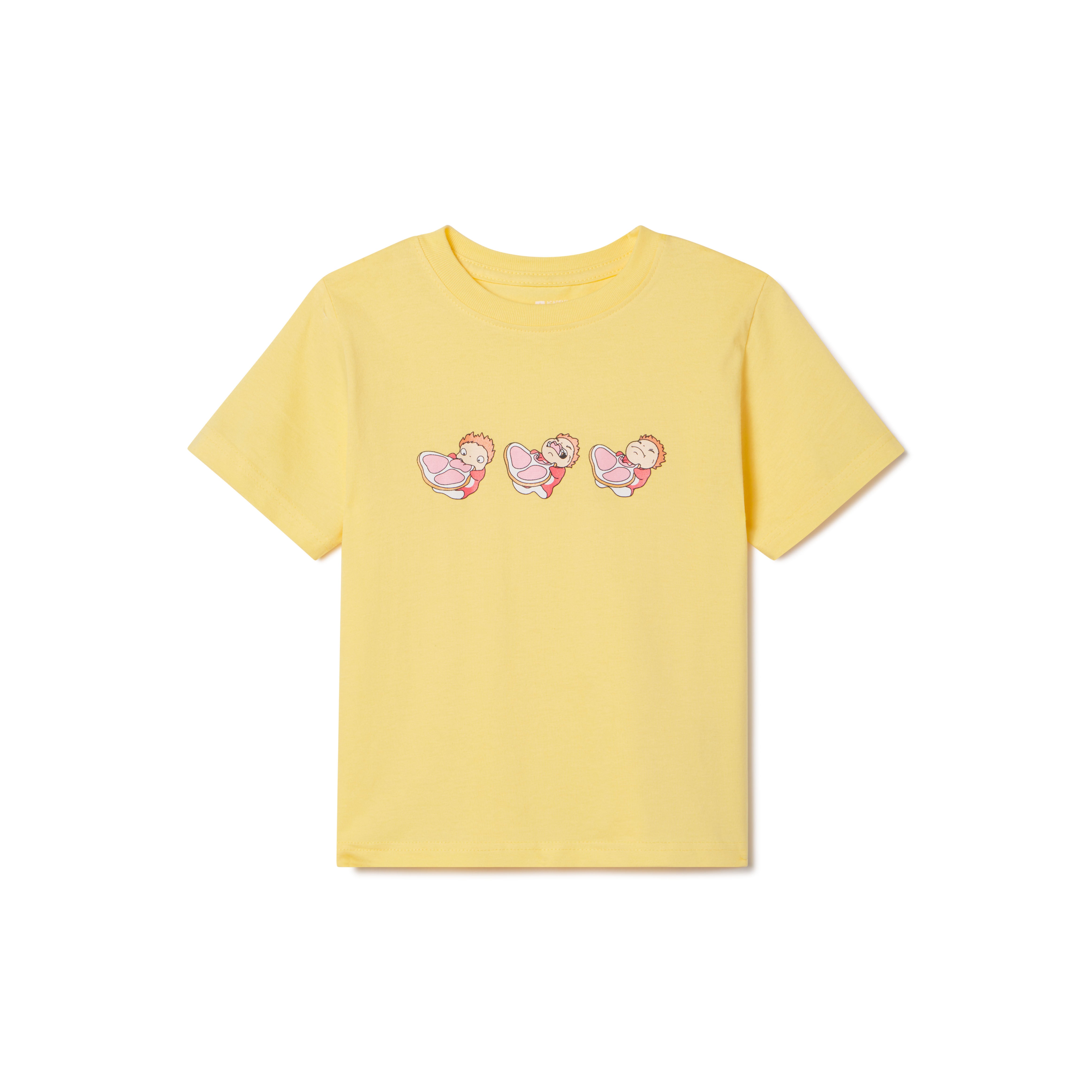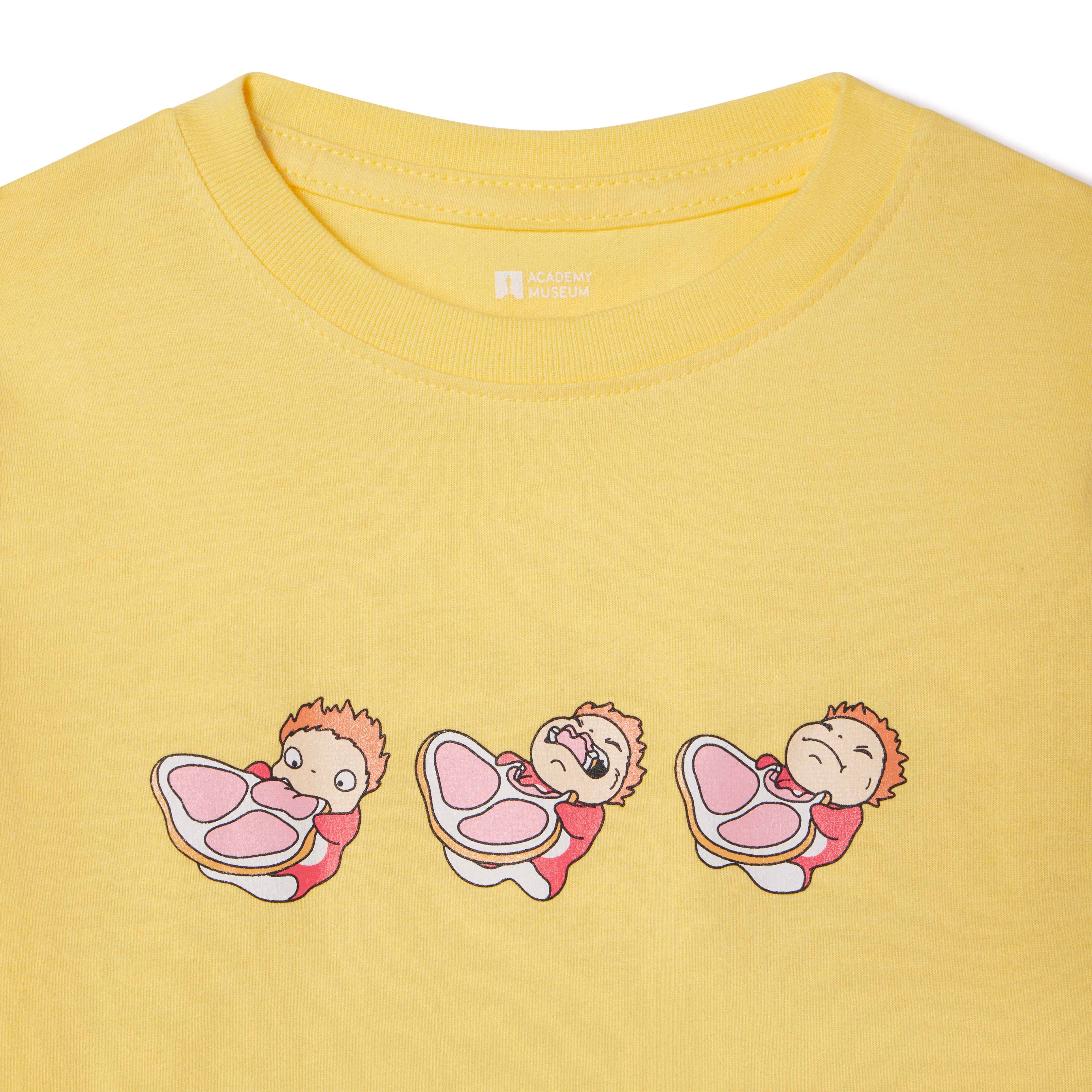 Ponyo's ham-loving adventures come to life on this cheerful yellow tee! Featuring three delightful poses of Studio Ghibli's spirited character, this graphic celebrates the whimsical magic of Miyazaki's underwater world.