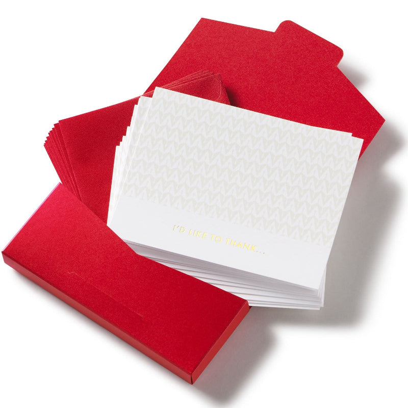 NEW ARRVIAL! Thank you card set of 10 folded notecards and Academy Red® envelopes featuring the Oscars® gold logo monogram. Each notecard features "I'd like to thank" on the front and features The Academy® seal inside in gold holographic foil. Inspired by the envelopes used at The Academy Awards®, these thank you note card and evelope set are the perfect way to thank the special person in your life, or ue them to write your acceptance speech for when you take home the award! For the first time ever, these red Oscar® logo embossed envelopes have been place for public sale and are sold exclusively at the Academy Museum Store.