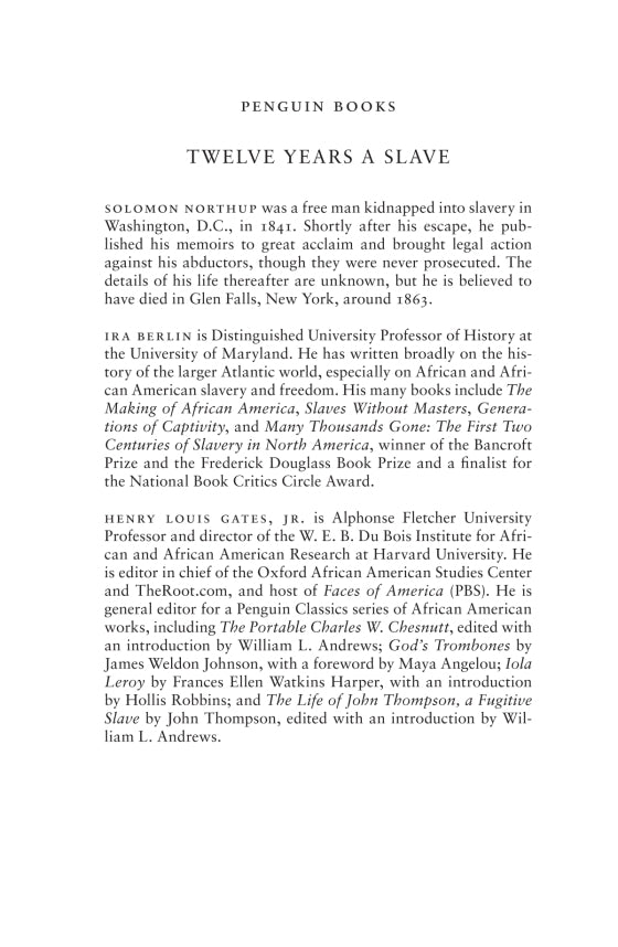 12 Years a Slave (Movie Tie-In) (Penguin Classics) – Illustrated, September 4, 2013 by Solomon Northup (Author), Henry Louis Gates (Editor, Afterword), Ira Berlin (Introduction), Steve McQueen (Foreword).