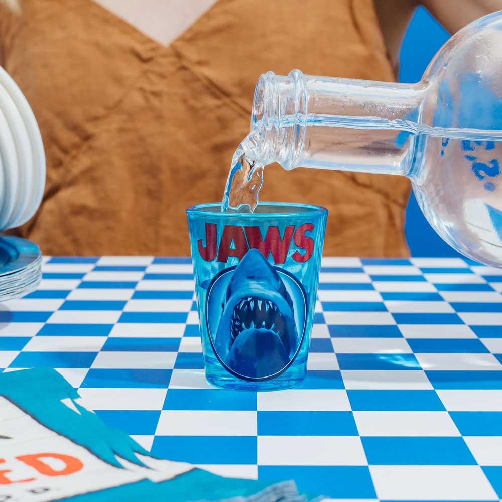 Relive the suspense of Steven Spielberg's legendary summer blockbuster with this Jaws mini shot glass, a collectible that perfectly captures the terror and thrill of cinema's most infamous great white shark.
