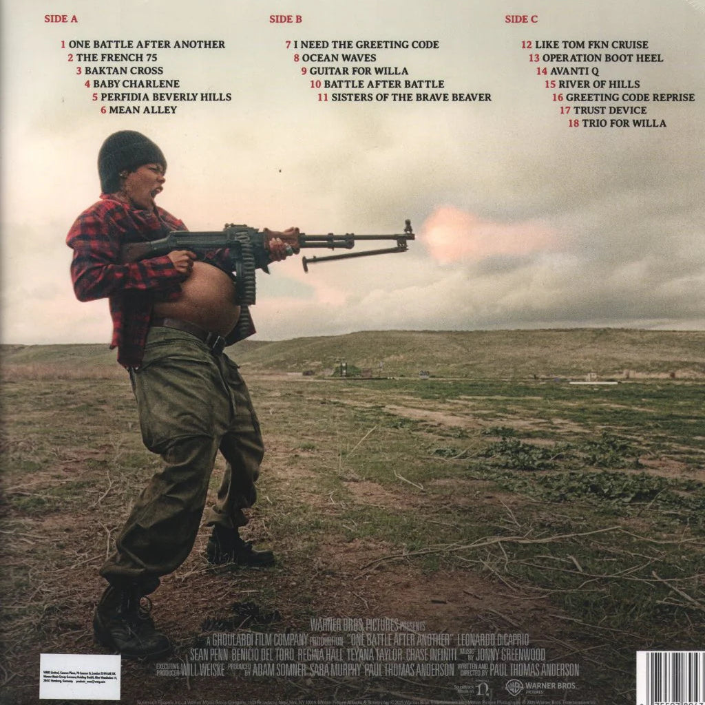 Double vinyl LP pressing of Jonny Greenwood’s score to One Battle After Another, written and directed by Paul Thomas Anderson. The film stars Leonardo DiCaprio, Sean Penn, Benicio Del Toro, Regina Hall, Teyana Taylor, and Chase Infiniti, and follows a former revolutionary forced back into action when his daughter goes missing.