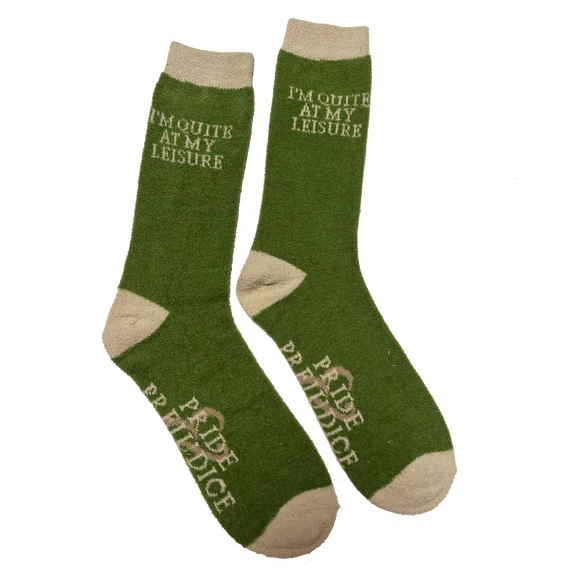 Pride & Prejudice "I'm Quite at My Leisure" Fuzzy Socks Wrap your feet in ultimate comfort with the Pride & Prejudice "I'm Quite at My Leisure" Fuzzy socks. Crafted with super-soft, warm fabric, and a touch of Mr. Bennet's wit and his famously dry declaration, these fuzzy socks are perfect for lounging in true literary style.